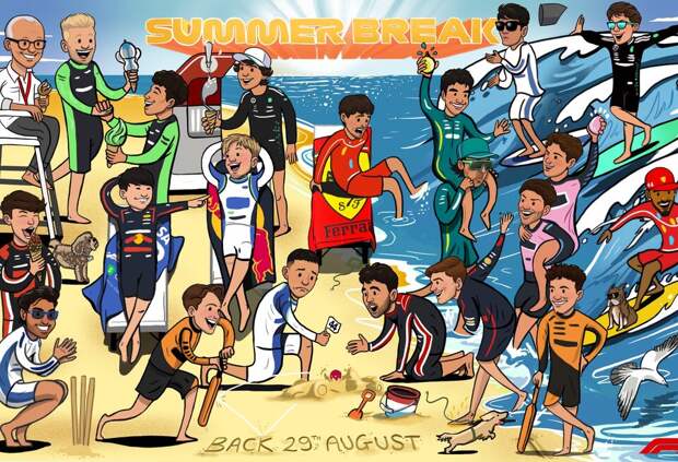 На иллюстрации, опубликованной в официальных аккаунтах Формулы 1 в соцсетях, её авторы показали отдых всех гонщиков серии.