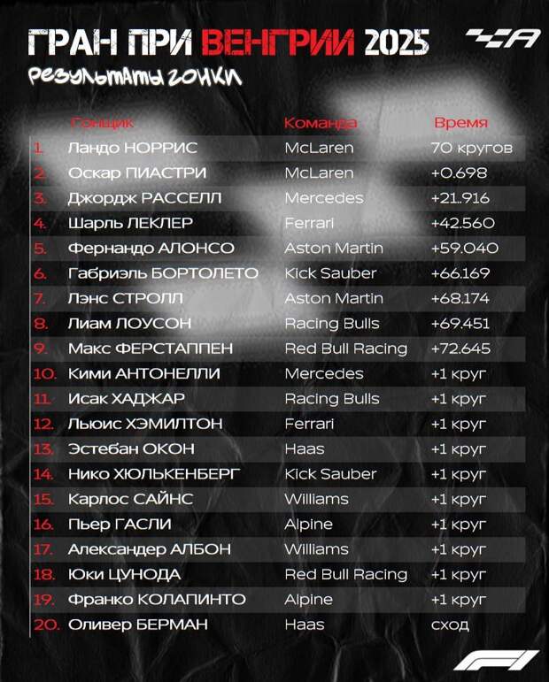 Результаты Гран При Венгрии Формулы 1 2025 года