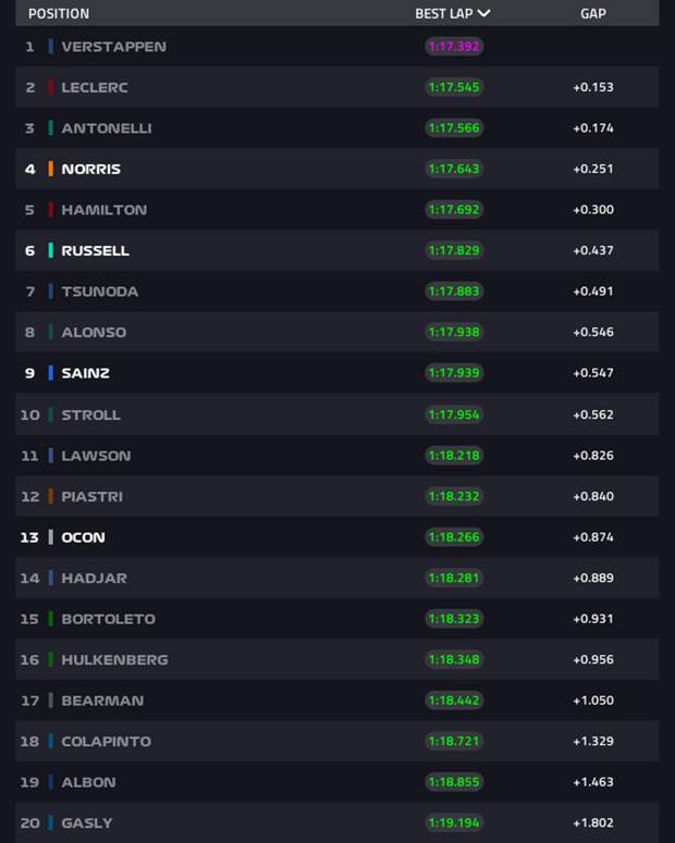 Антонелли уступил голландцу 0,174 секунды.Пилоты McLaren Ландо Норрис и Оскар Пиастри расположились на четвёртом и 12-м месте соответственно: британец уступил лидеру 0,251 секунды, а австралиец – 0,840 секунды.