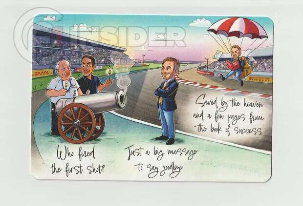 На лицевой стороне карточки — сатирический рисунок из вселенной Red Bull. Оливер Минцлафф и Хельмут Марко стреляют из пушки Кристианом Хорнером, но он приземляется мягко благодаря многомиллионному приданому. Отсылка очевидна: в Red Bull в 2025 году каждый сыграл свою роль в борьбе за власть.